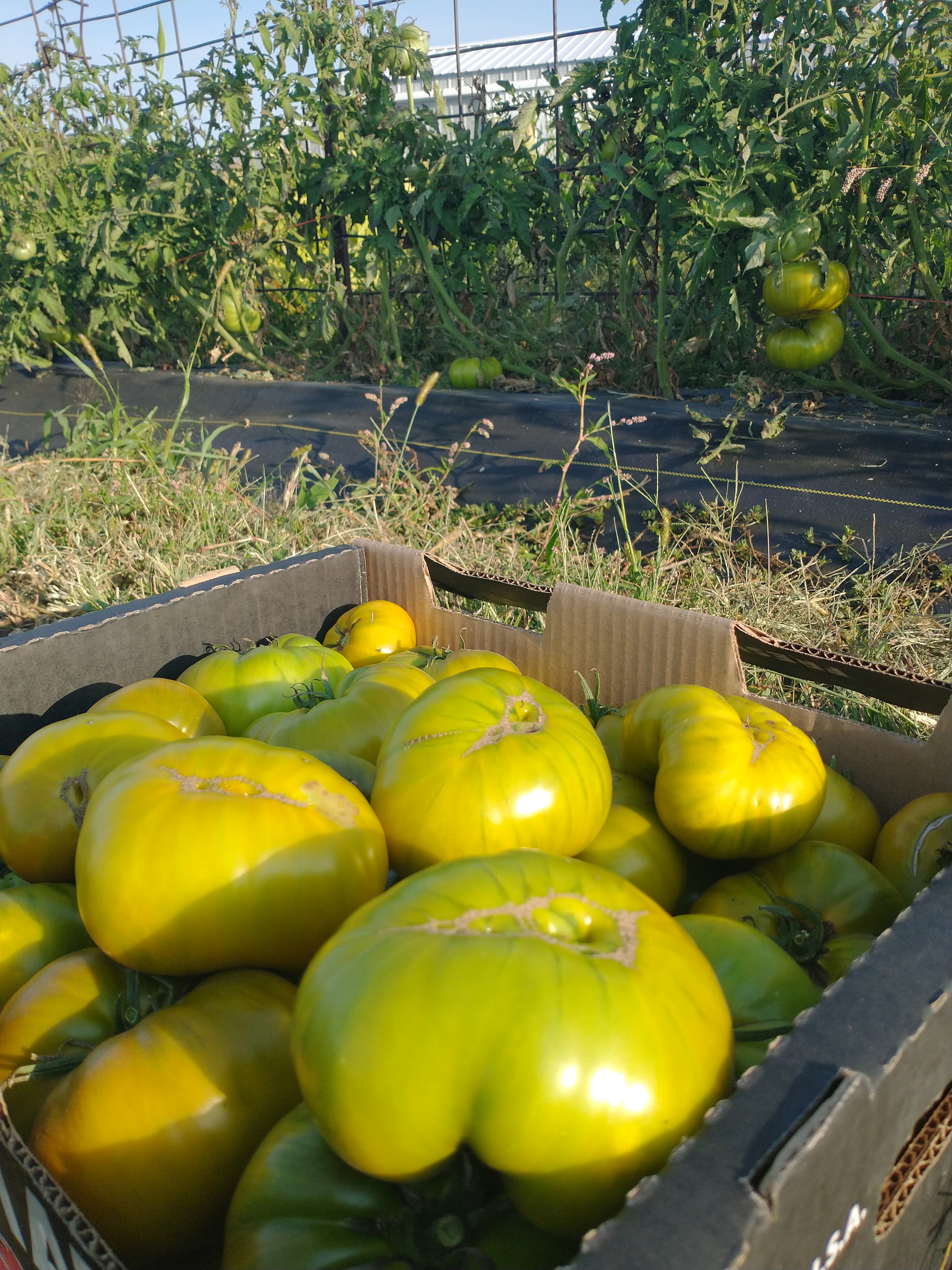 While our cherry tomatoes continue to be picked fresh (and are still bursting with flavor!), a heads up that because of the cooler seasonal conditions, our slicer tomatoes may not be as flavorful as they usually are during the summer! I personally can’t tell the difference, while many others out there can and do. That said, you may enjoy these more as cooked tomatoes, but again, everyone is different.