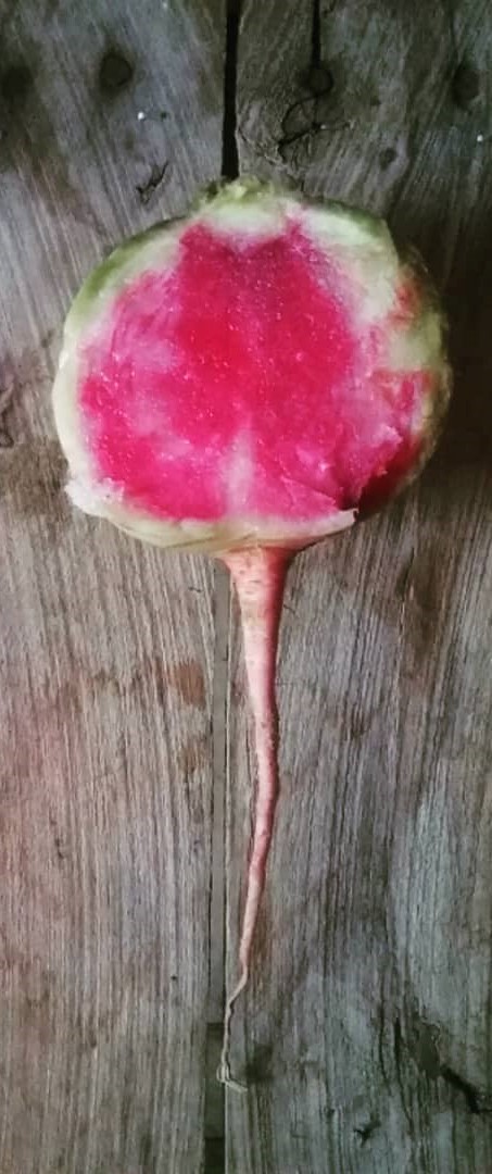 Lots of people who come to our farmers market stand in Dubuque on Saturdays eye these roots and say “Turnips, right?” Our stock answer is of course “No – they’re arguably better. They’re watermelon radishes!” But in reality, another good answer would be “Kinda – yes!”